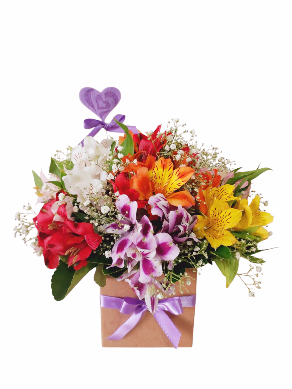Puro charme esse arranjo de alstroemerias coloridas! Seja para presentear em uma data especial, ou até mesmo decorar qualquer ambiente! Acompanha um pic coração e pra finalizar um laço de cetim em volto a caixa.