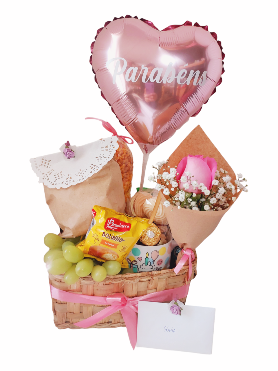 Esse é um sucesso entre nossos clientes, por ser um café da manhã completo, com produtos de qualidade e super charmoso mesmo! Fazemos com as seguintes opções de temas: amor, aniversário, com carinho, feliz Dia e neutro, basta escolher o tema no campo observação ou no chat.