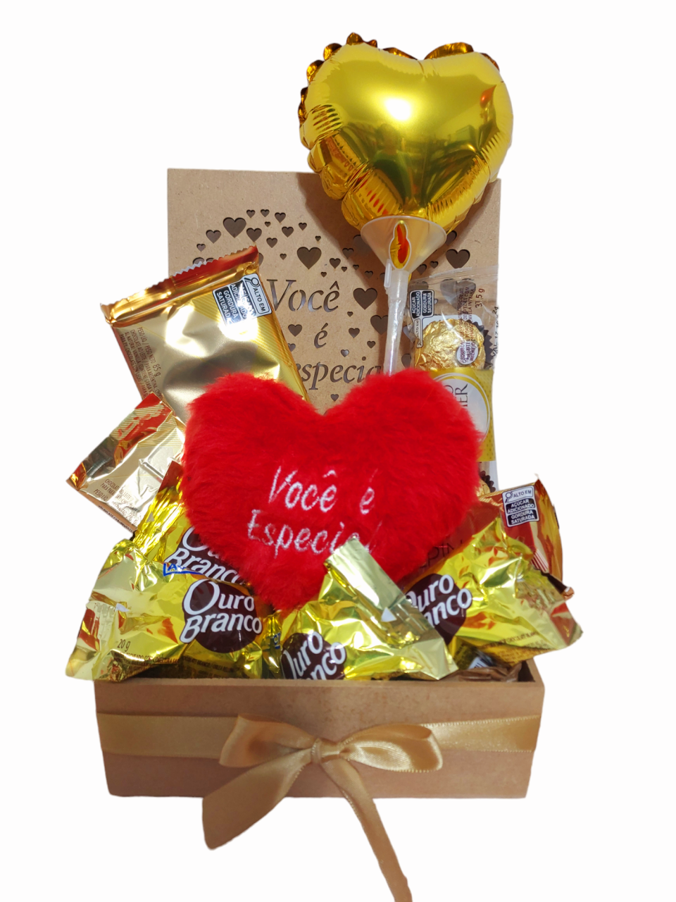Carregando...A 'Caixa Você é Especial' é uma adorável caixa de Mdf que transborda carinho e atenção em cada detalhe. Ela contém: um urso chaveiro. A doçura fica por conta de uma suntuosa barra de Alpino de 80g e duas barras de 20g cada, ideal para os amantes de chocolate. Há também um trio de Ferrero Rocher, trazendo um toque de sofisticação. Quatro bombons Ouro Branco adicionam uma dose extra de doçura irresistível. A caixa ainda inclui um charmoso balão pequeno, e tudo é cuidadosamente embalado com celofane e finalizado com um laço, para uma apresentação verdadeiramente encantadora.